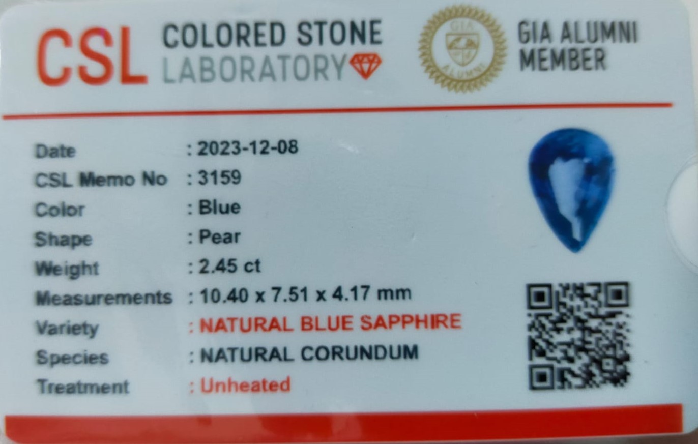 Indulge in elegance with our 2.45 carat Pear Shape Blue Sapphire. Its captivating hue and natural brilliance make it a coveted addition to any collection. Inquire now to uncover its beauty.