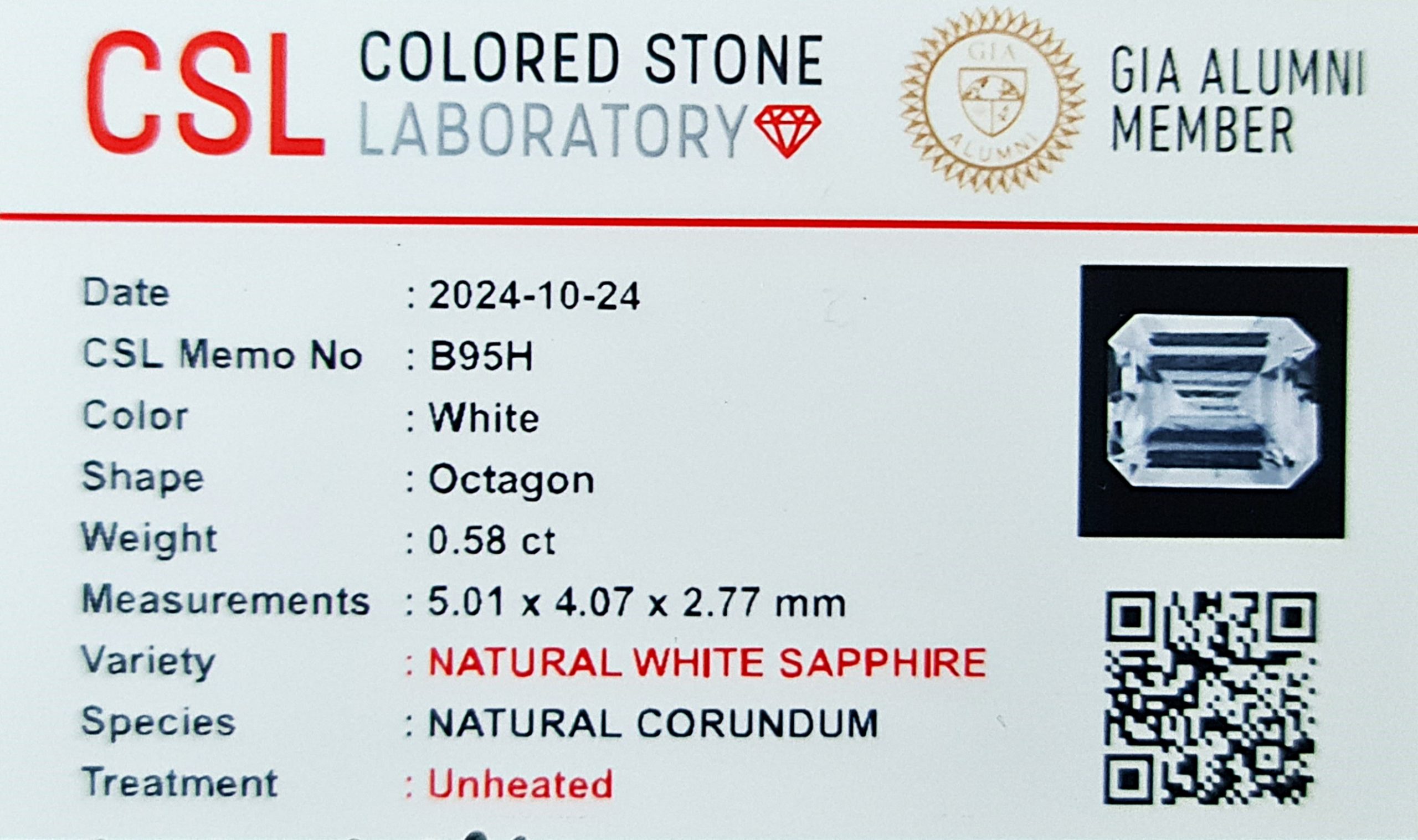 0.58 Ct Natural White Sapphire Gemstone – Unheated Octagon Cut